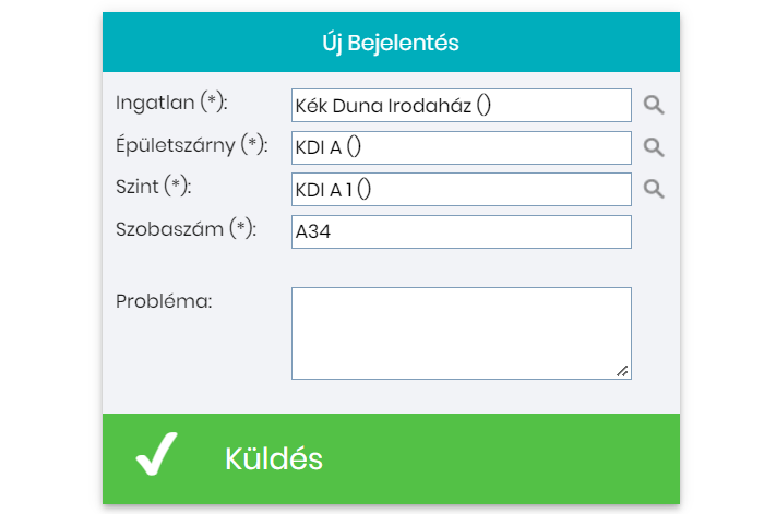 A-megoldás: a bejelentő kötelezően válassza ki a felbukkanó értéklistából az ingatlant, épületszárnyat, emeletet és szobaszámot. Mérnöki szemmel ez lenne a precíz, valóságot legjobban lekövető megoldás. A karbantartók pontosan tudnák, hova kell menniük, és rendszer szinten is helyiség pontosságú statisztikákat lehetne készíteni a bejelentésekről. Csakhogy nem ez az egyetlen, de még csak nem is ez a legfontosabb tervezési szempontunk. Egy ilyen képernyő hármas terhet ró a felhasználókra minden alkalommal, amikor bejelentenek – e miatt utálkozni fognak. További gond, hogy az üzemeltető cég adminisztrátorainak folyamatosan naprakészen kell tartaniuk az épületek, emeletek, helyiségek nyilvántartását, ami több tucat vagy száz ingatlan esetében nem egyszerű feladat. A precizitás árát ez esetben igen komoly adminisztrációs munkával kell megfizetnünk: