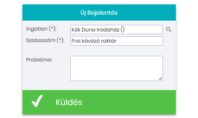 B-megoldás: a bejelentő az ingatlan kiválasztása után egyetlen szabad szöveges mezőbe írja bele, hová várja a szerelőket. Első látásra primitív megoldásnak tűnik, de a felhasználók imádni fogják a csodásan egyszerű űrlapot. Az adminisztratív teher szinte zéró, ami azt is jelenti, hogy szinte azonnal be lehet majd vonni a rendszerbe egy-egy új ingatlant. Az adataink természetesen meglehetősen pontatlanok lesznek, nem tudunk helyiség szintű statisztikákat készíteni – de meglehet, hogy ilyenre senkinek nincs is szüksége. Ha a helyszínt jól ismerő technikusaink vannak, akkor ez teljesen működőképes megoldás lesz:
