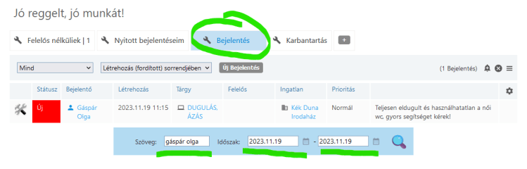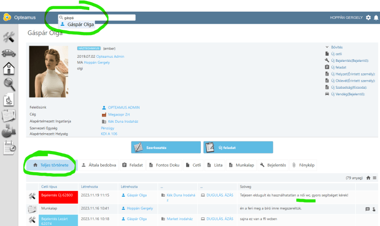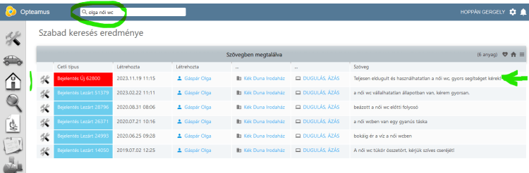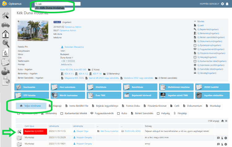 Hogyan találjuk meg a rendszerben azt a mai hibajegyet, amiben Gáspár Olga – a Megacorp nevű bérlőnktől – panaszkodott, hogy a Kék Duna Irodaház női wc-je eldugult? Opteamusban akár 6 féle módon is…
