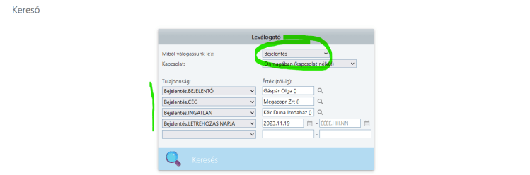 Minden rendszerben kell lennie egy általános keresőnek is, ahol körülményesen, de egy tetszőlegesen bonyolult keresési feltételt megadhatunk. Itt precízen lehet közölni, hogy azt a bejelentést keressük, amit Gáspár Olga dobott be, a mai napon, a Megacorp cégtől, a Kék Duna Irodaházból. Na, ez a megoldás végképp nagyon távol áll a természetestől! A kereső képernyő ugyan szemre rendezett, de a kezelése mégsem egyszerű, mert az átlagos felhasználótól nem várható el, hogy a bejelentés adattípus tulajdonságai közt kiismerje magát.