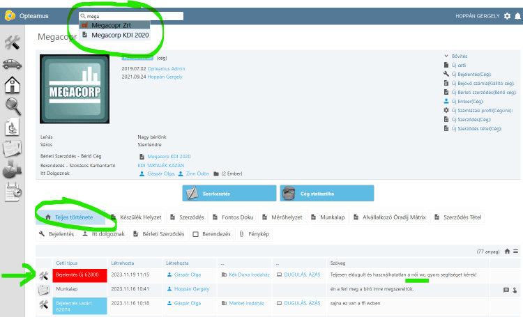 Mint férfi, nyilván Olga nevével indítanám a keresést, de egy Property Manager számára nem annyira a női nevek, hanem a bérlő cégek a lényegesek. Sebaj, ők majd a Megacorp nevet írják a gyorskeresőbe, így Opteamus máris megmutatja a cég adatait, és a Megacorphoz kapcsolódó friss adatok közt ugyanúgy azonnal meglátja majd Olga mai bejelentését. Mert Opteamusban ugyanaz az adat több irányból is megtalálható.
